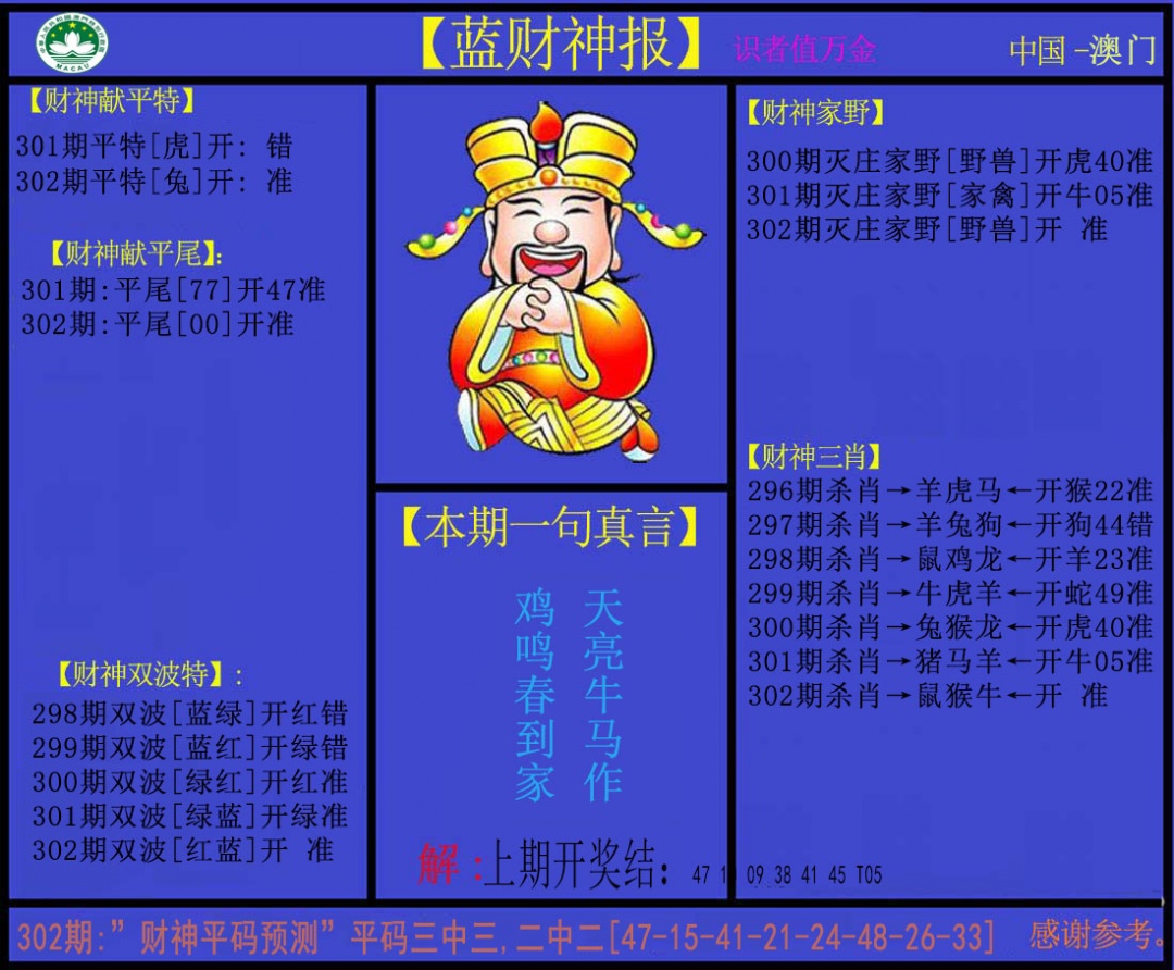 302期: 澳门六合彩彩圖信封【蓝财神报】每期自动更新